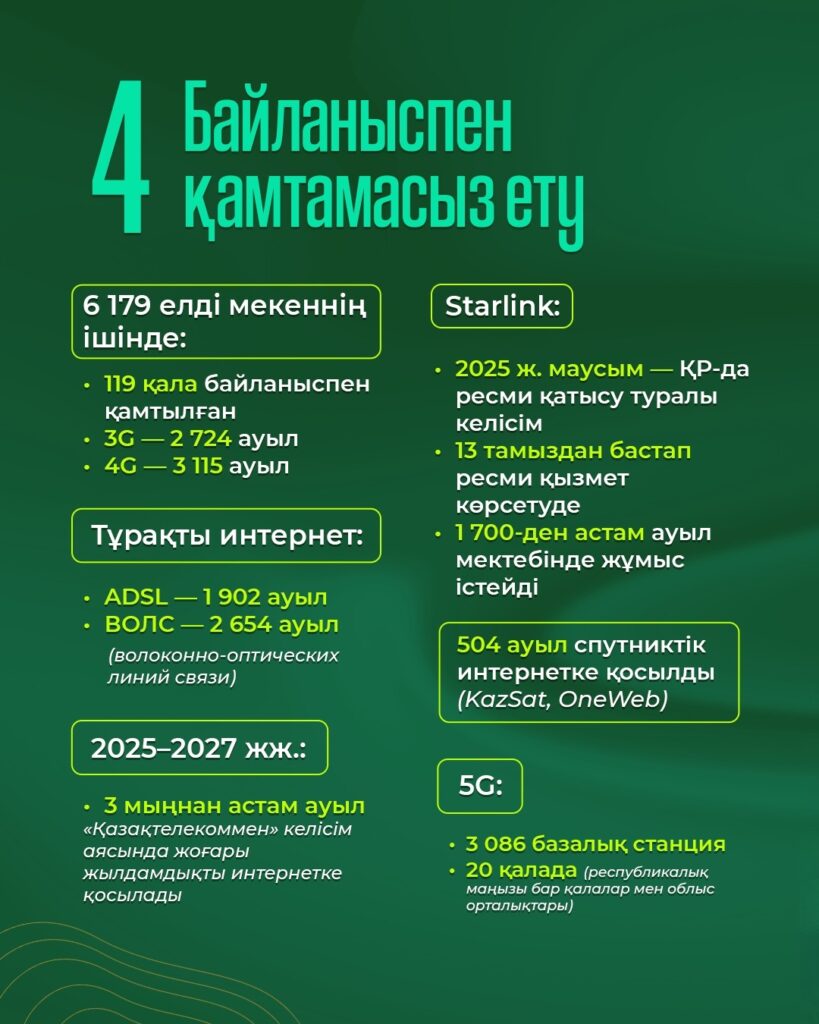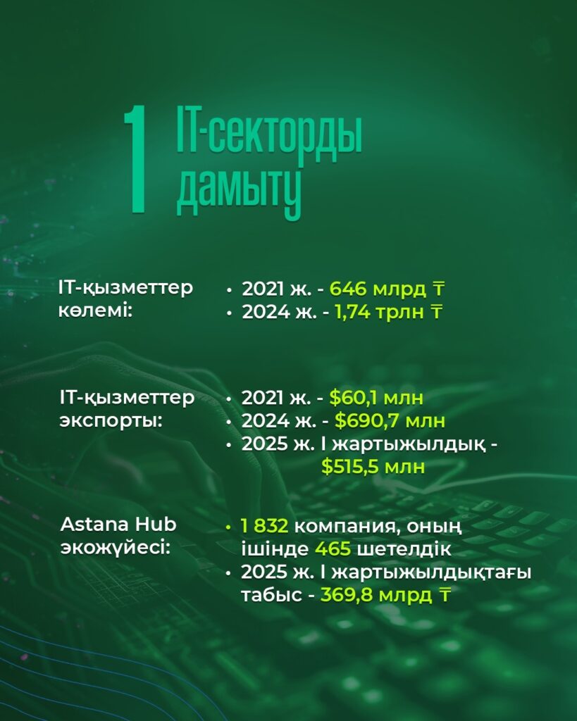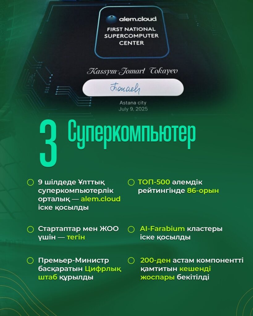 Жасанды интеллект саласында да жүйелі қадамдар жасалуда. 2025 жылғы 17 қарашада «Жасанды интеллект туралы» Қазақстан Республикасының Заңына қол қойылып, саланың құқықтық негізі қалыптастырылды. Ал 2 қазанда Халықаралық жасанды интеллект орталығы – Alem.AI ашылып, отандық және халықаралық сарапшылардың бірлескен жұмысына жол ашты.