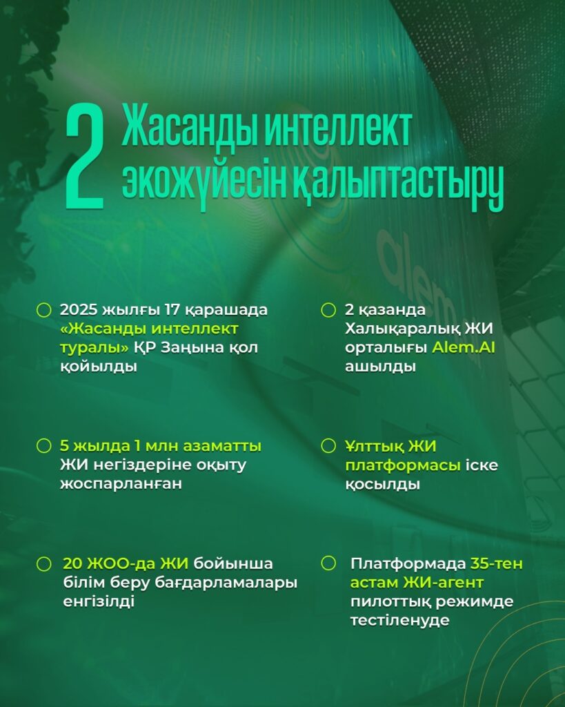 Алдағы 5 жыл ішінде 1 миллион азаматты жасанды интеллект негіздеріне оқыту жоспарланып отыр. Бұл бастама қоғамның цифрлық сауаттылығын арттыруға және жаңа технологияларды кеңінен қолдануға бағытталған. Сонымен қатар Ұлттық жасанды интеллект платформасы іске қосылып, бүгінде онда 35-тен астам ЖИ-агент пилоттық режимде тестіленуде.
