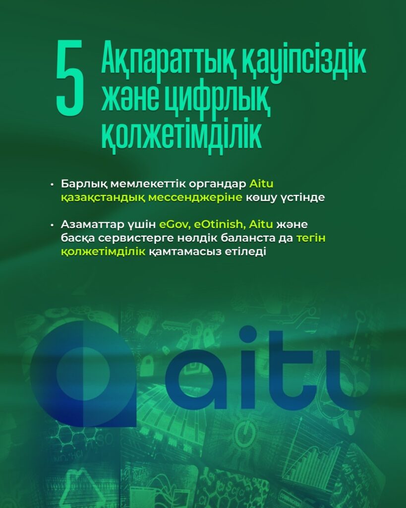 Білім беру саласында да маңызды өзгерістер бар. Қазіргі уақытта 20 жоғары оқу орнында жасанды интеллект бағытындағы білім беру бағдарламалары енгізіліп, білікті кадрлар даярлауға басымдық берілуде. Цифрландыру мен жасанды интеллектті дамытуға бағытталған бұл кешенді шаралар еліміздің технологиялық дамуын жеделдетіп, мемлекеттік қызметтерді халыққа барынша ыңғайлы әрі тиімді етуге негіз болмақ.