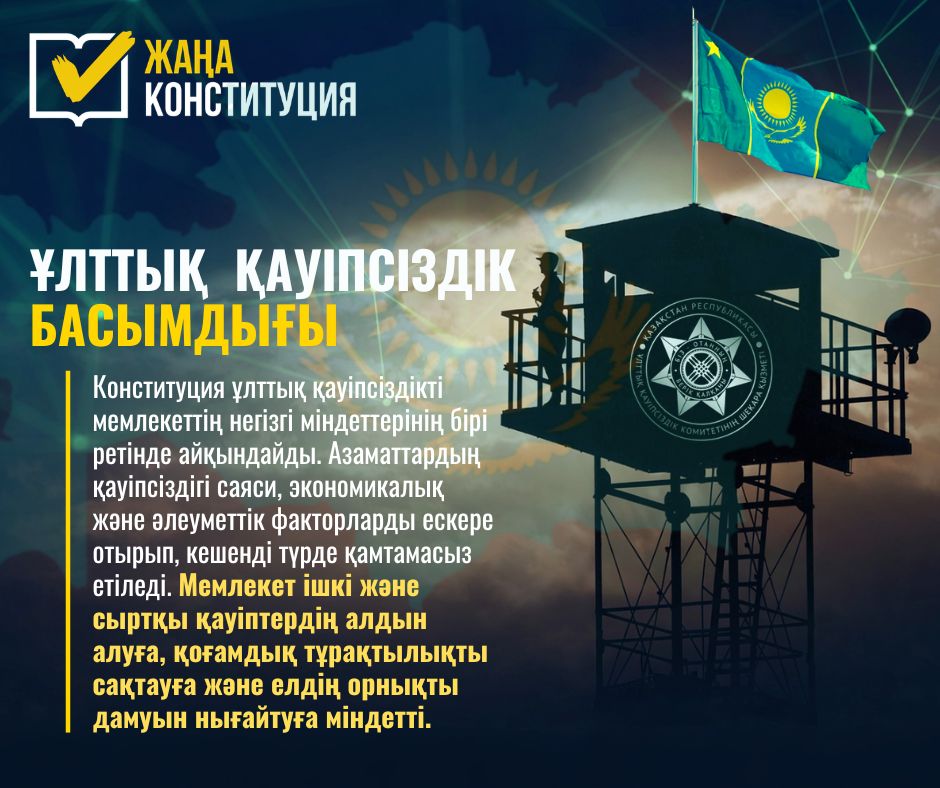 Қазақстан Республикасының жаңа Конституциясы елдің ұлттық қауіпсіздігін қамтамасыз етуді негізгі мемлекеттік басымдықтардың бірі ретінде қарастырады. Қауіпсіздік – елдің тұрақтылығы мен экономикалық, әлеуметтік дамуының кепілі болып табылады. Сондықтан мемлекет өзінің азаматтарының қауіпсіздігі мен мемлекеттің тұтастығын қорғауды құқықтық деңгейде қамтамасыз етеді.